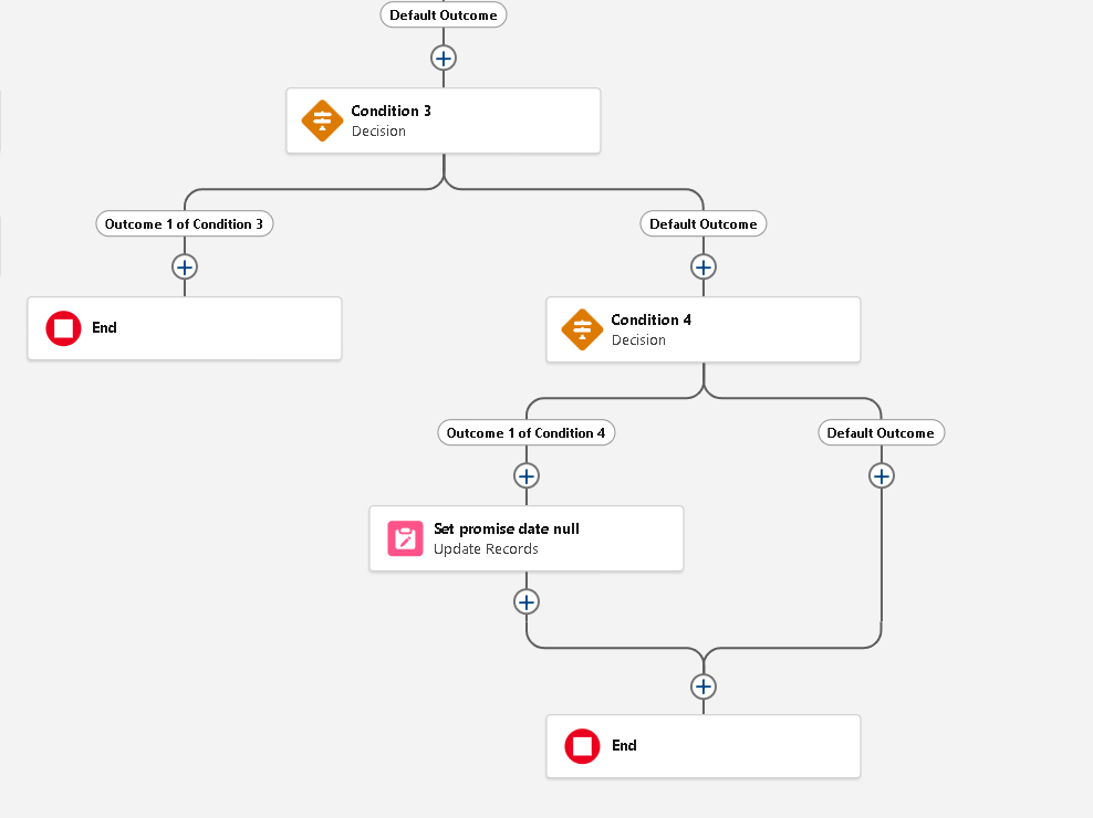 As you may notice, you can configure the Decision element for Condition 3 and route its immediate path to an End element. Alternatively, you can skip this condition altogether and include it directly in the entry criteria of the second Flow — both approaches are valid, depending on your design preference.