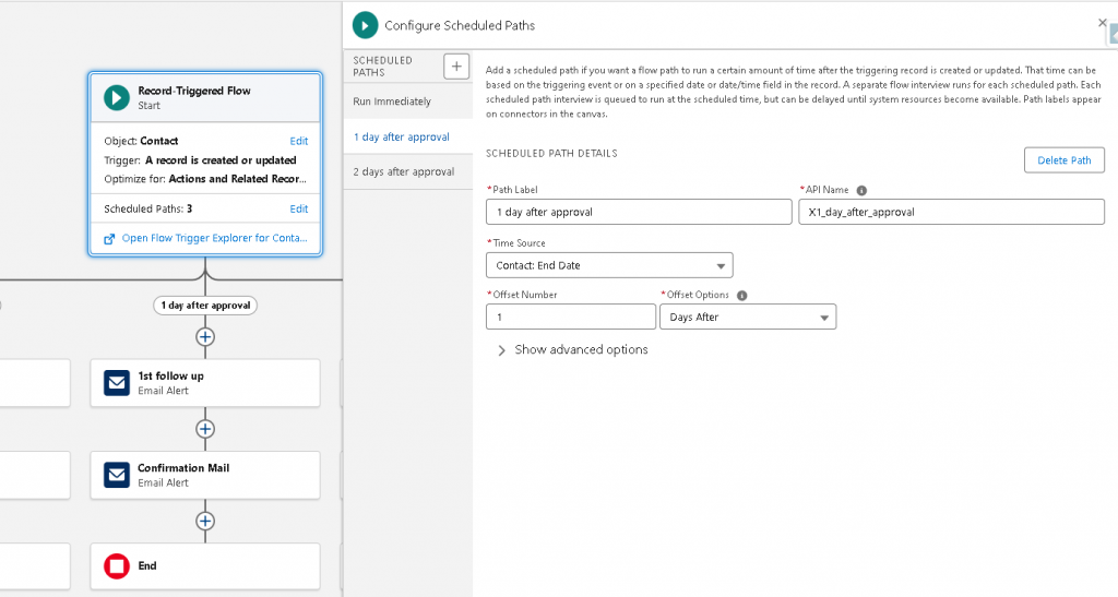 For the scheduled-action branch, we’ll create a separate record-triggered Flow with scheduled paths. In the Scheduled Paths section, configure one scheduled path for each scheduled action defined in the original Process Builder.