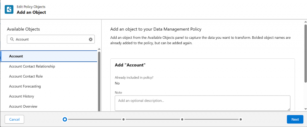 Choose the objects that the policy evaluates. Object selection strictly defines policy scope. Common examples include Account, Case, custom objects, or consent-related objects.
