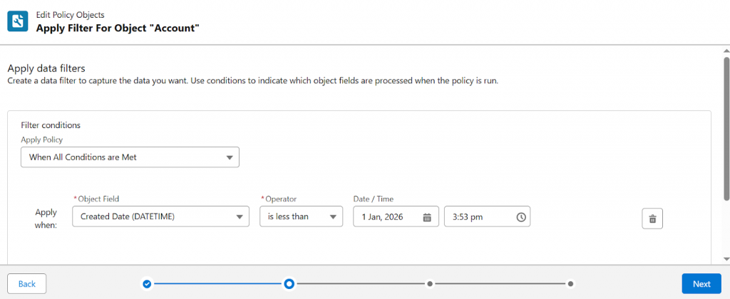 Define filter conditions to determine which records qualify for processing. For example, a filter may restrict evaluation to records created before a specified date-time value.